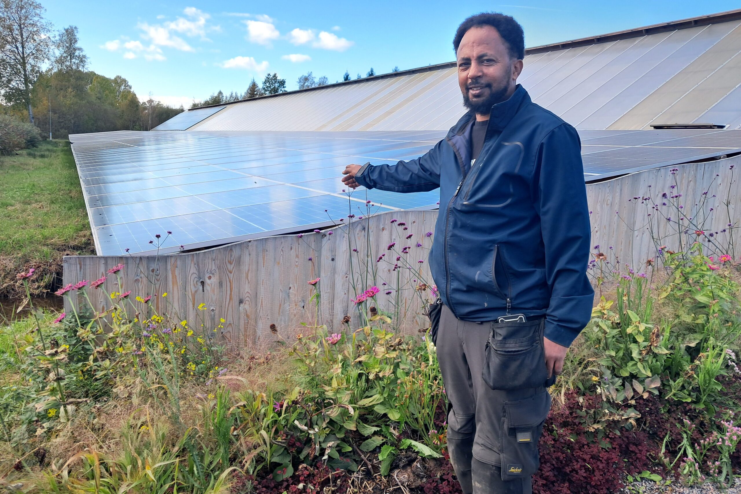Abraham Tesfaldet har arbetat här i solparken i över tio år. Han visar runt bland raderna av solpaneler och berättar hur han och kollegorna byggt ut parken under året.